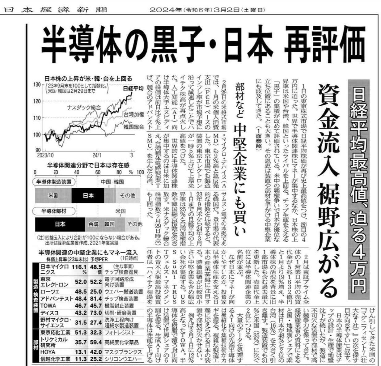 しかし、この記事では「『黒子』の集積が改めて評価されている」と、ポジティブなものになっている。話の本筋としては、「半導体生産に必要な素材株までが高値で売買されていることで、バブルっぽくなっている」とするのが正論だろう。