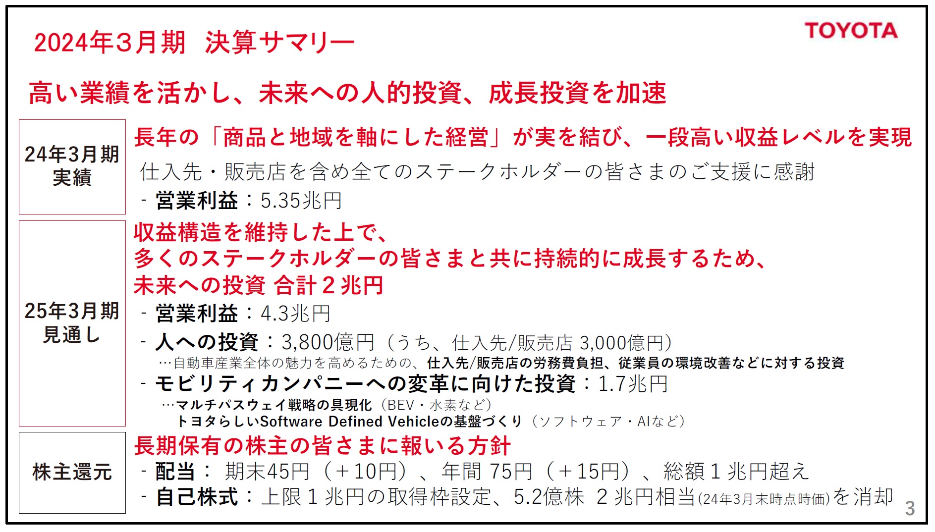 「当社は、⾧年にわたり商品と地域を軸にした経営に取り組んできました。従業員はもとより、仕入先・販売店を含む多くの関係者の皆さまのご支援とご協力により、24年3月期の営業利益実績は5兆3,500億円となりました。また、25年3月期の見通しは、前期の収益構造を維持した上で自動車産業全体の魅力を高め、全てのステークホルダーの皆さまと共に成⾧していくため、未来への投資を合計2兆円実施し、営業利益4兆3,000億円といたしました。2兆円の未来への投資には、人への投資3,800億円、モビリティカンパニーへの変革に向けた投資1兆7,000億円を織り込んでいます」