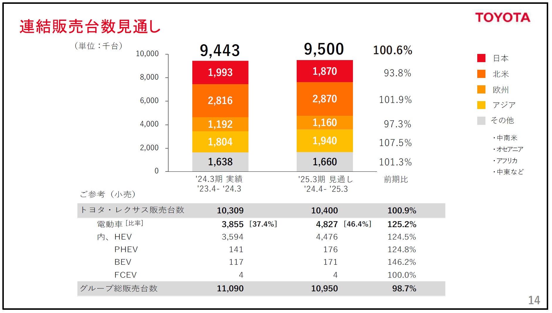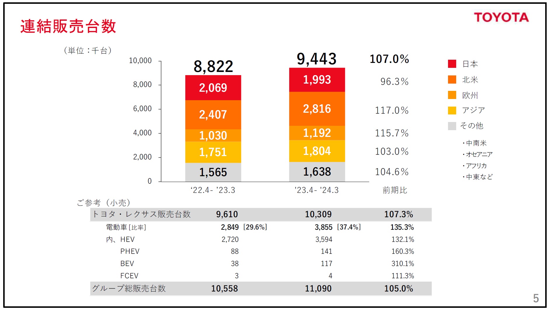 ビジネスの状況で言えば、当期の連結販売台数は、前年同期に対して107.0%となる944万3千台、トヨタ・レクサス販売台数は前年同期に対して107.3%となる1,030万9千台である。ダイハツ工業と豊田自動織機の出荷停止の影響があった日本を除いて、販売台数は増加している。また電動車はハイブリッド車を中心に増加し、37.4%となっている。