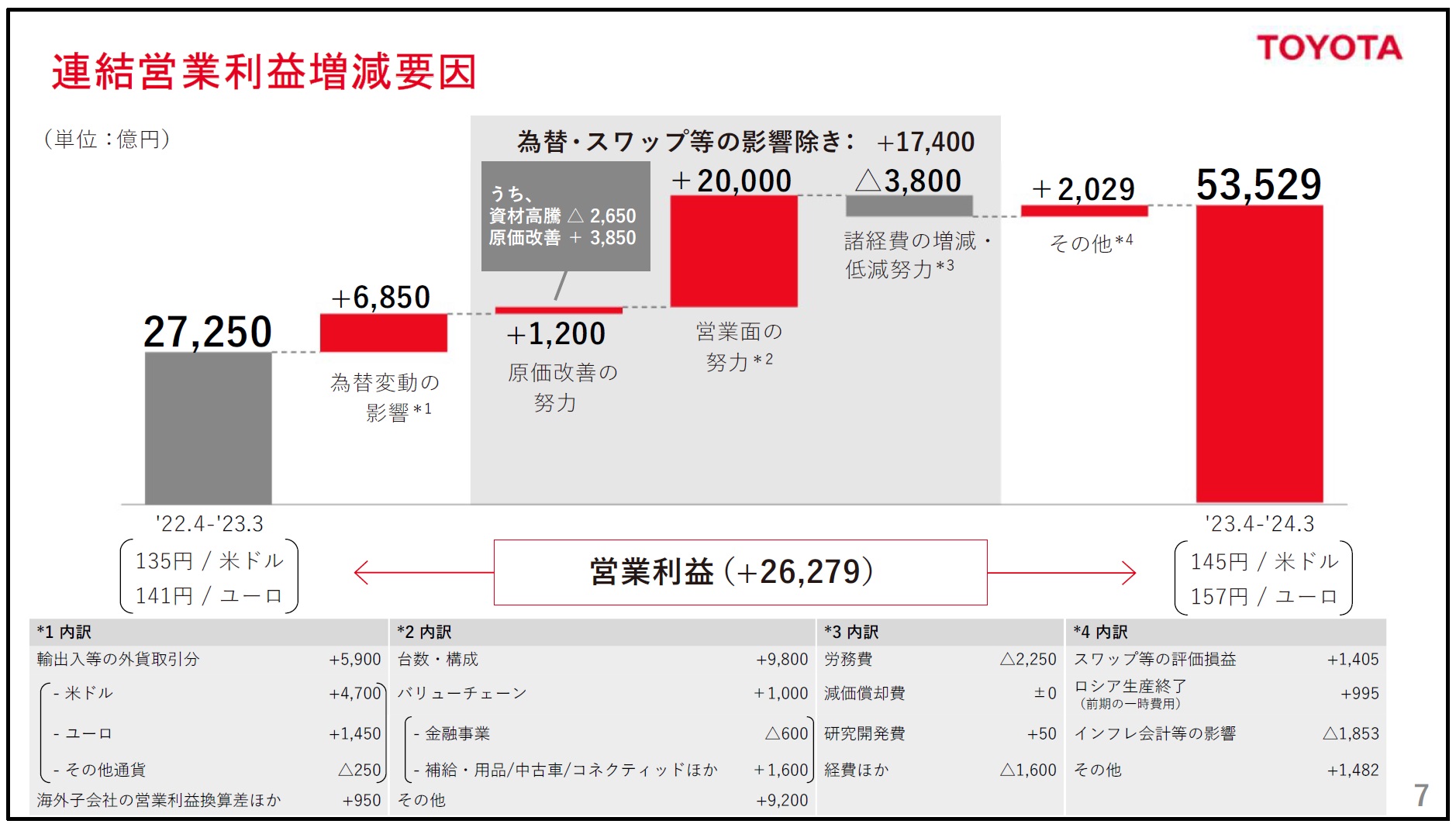 一方、「円安メリットだけでしょう?」という声も多く聞こえてくるようだが、連結営業利益の増減要因を見ると、(営業利益が対前年同期比で2兆6,279億円増加した内の)為替差益は、わずか6,850億円に過ぎない。つまり、そのほとんどをやはり「営業努力」で稼ぎ出していることがわかる。今期の実績為替はドルが145円、ユーロが157円である。