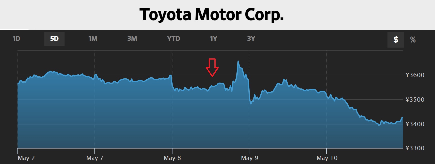 - 日本の時価総額最大の会社が史上最大の5兆円超の営業利益を発表したにもかかわらず、株価は4%近くも落ち込んだ。これは、「円」の弱さを示唆していることに他ならない。