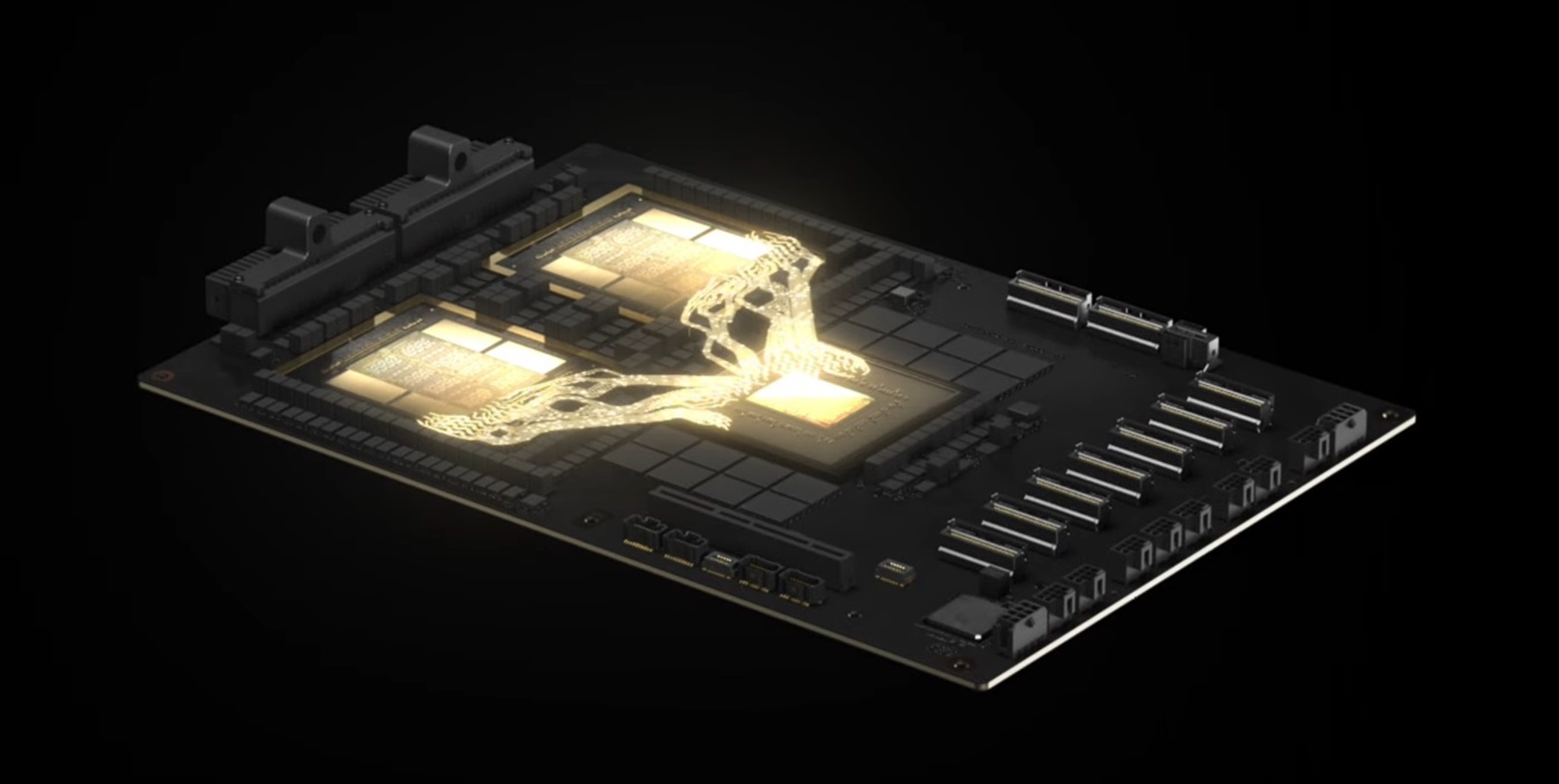 下の写真は、エヌビディアのBlackwell GPUだ。光り輝く二つのGPUと、中央に光るのがGrace CPU。このひとつの基板上のセットで「エヌビディアのGPU」と呼ぶ。これも混乱を招くひとつの要因とは思うが、ArmアーキテクチャーのCPUとエヌビディアのGPUが補完的に機能し、共存していく形が最も現実的だということの説明になる。