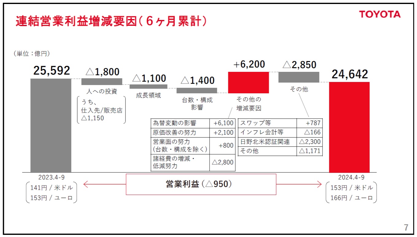 なぜ私がここまで言うのか。それは、通常に決算書を読むファンドマネージャーやアナリストならば今回のトヨタ自動車の決算を「+5.9%増収、△3.7%減益の決算」と読むからだ。さらに言えば、営業利益の減益額△950億円には、期初から予定されていた「人への投資」が△1,800億円、そして「成長領域への投資」として△1,100億円が含まれており※1、合わせると△2,900億円は前向きな意図したコストが足を引っ張っているだけなのだ。つまりこれを除けば、営業利益は+1,950億円の増益となる決算だ。