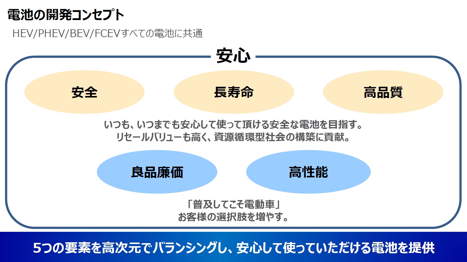 そしてトヨタが電池開発において重要と考えているポイントは下図の通り5つのポイントとなる。