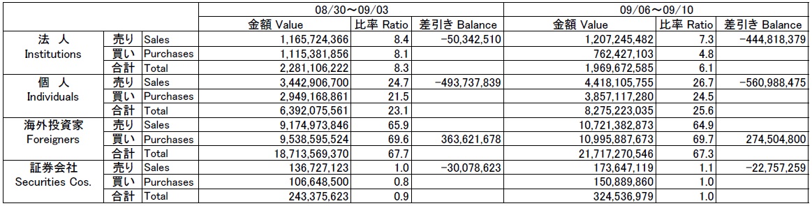 まず個人投資家は前週に引き続き売越しの約△5600億円に対して、海外投資家は約2745億円の買い越し。個別に見ると、個人投資家は約3兆8571億円の買いに対して、海外投資家は約10兆9959億円の買いと3倍近く買ってきているのが分かる。売りは個人投資家が約4兆4181億円に対して、海外投資家は約10兆7214億円。