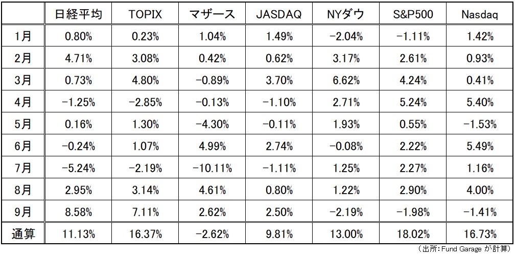 9月は米国市場はNYダウ、S&P500、ナスダックと揃ってマイナス圏に沈んだままだった。一方で日本市場は日経平均株価、TOPIX、マザーズそしてJASDAQと4指数揃ってプラス、中でも日経平均株価は8.58%も上昇している。通年で見るとS&P500とまでは行かないまでも、株式市場全体の動きを象徴すると言われているTOPIXが、活況のナスダックに一気に肉薄する状況だ。