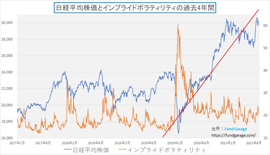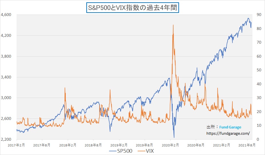 下記のチャートはS&P500と恐怖指数(VIX指数)の相関チャートだが、紺色の線で示したS&P500のコンスタントな右肩上がりの状態を見れば、誰もが高所恐怖症になり、一旦は利益を確定させたいと考えることは当然だろう。そしてテーパリングの話題や中国恒大集団の話をきっかけにして多少の利益確定売りが出たのは事実だろう。だがその先に持っていく場所が無い。当然とれとは逆の人達も居る。「押したところで買おう」と構えている人達だ。だからこそ、下がりきらない。結果として「ショートスクイーズ(売り方の買い戻し)」のように直ぐに株価は戻ってしまっている。