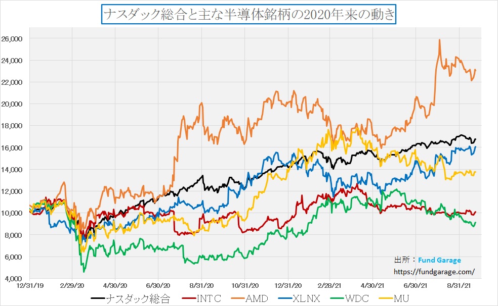 「半導体不足」とか、「半導体需給ひっ迫」などと騒がれているのでさぞや半導体株のパフォーマンスは良好だろうと考えがちだが、半導体そのものを作っている会社でパンデミック前の水準からNASDAQ全体を大きくアウトパフォームして飛び抜けている銘柄はほとんどない。