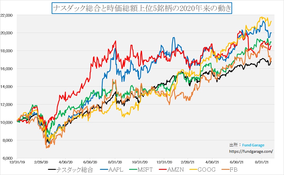 一方で下に示すのが所謂「GAFA+M」の値動きとナスダック総合指数との対比チャート。足元でFacebook(FB)が下落しているが、全銘柄がナスダック総合指数の騰落率を上回っているのがよく分かる。時価総額加重平均の指数でもあり、これら5銘柄が如何にナスダック総合指数を牽引しているのかがよく分かるというものだ。