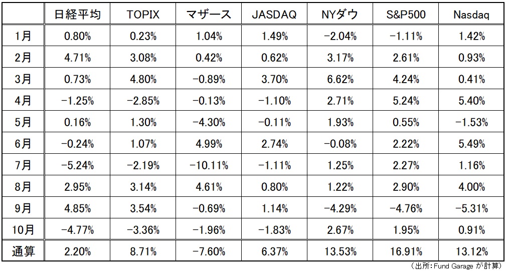 下記に日米主要市場の月毎の騰落率をブレークダウンしたいつもの表をご紹介する。米国市場に比べて年初来の騰落率で日本は圧倒的に分が悪い。