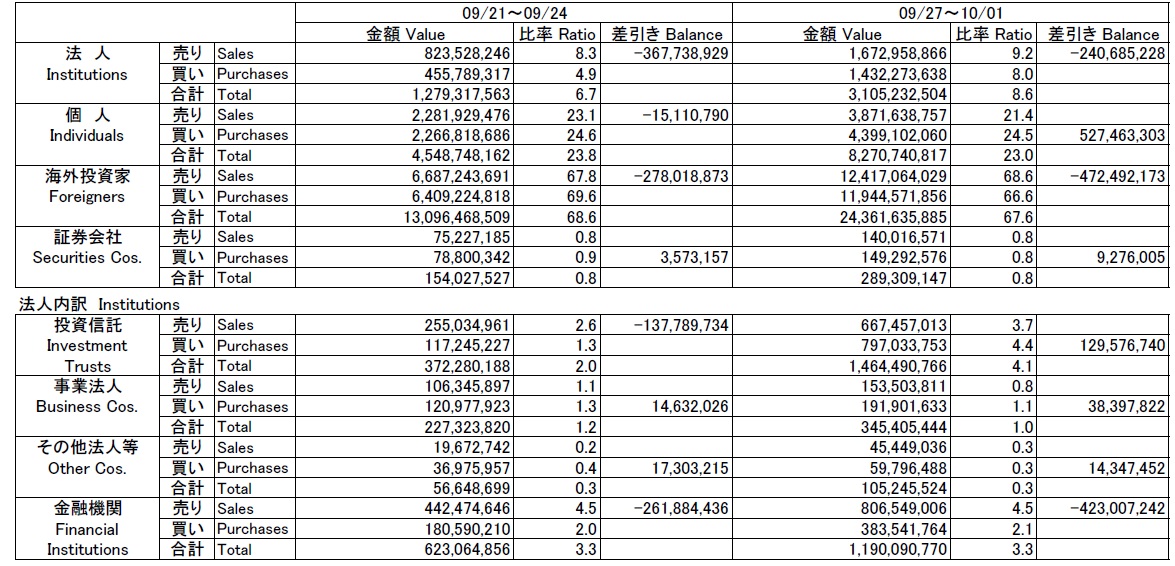 日経平均株価は先週木曜日、TOPIXは先週金曜日に漸く9月24日から続いた下落が止まり反転した。なんと日経平均株価が8連敗、TOPIXが9連敗にも及んだ。個人的には下げ過ぎと思ったが、一旦振り子が動き始めると慣性による惰性もあるのはよくあることだ。相変わらず国内金融機関は全セグメントで売り越しているが、これに個人投資家が立ち向かった構図がハッキリと出ている。不思議なぐらい海外投資家と個人投資家の方向性が重なることはないが、海外投資家とは機関投資家であり、