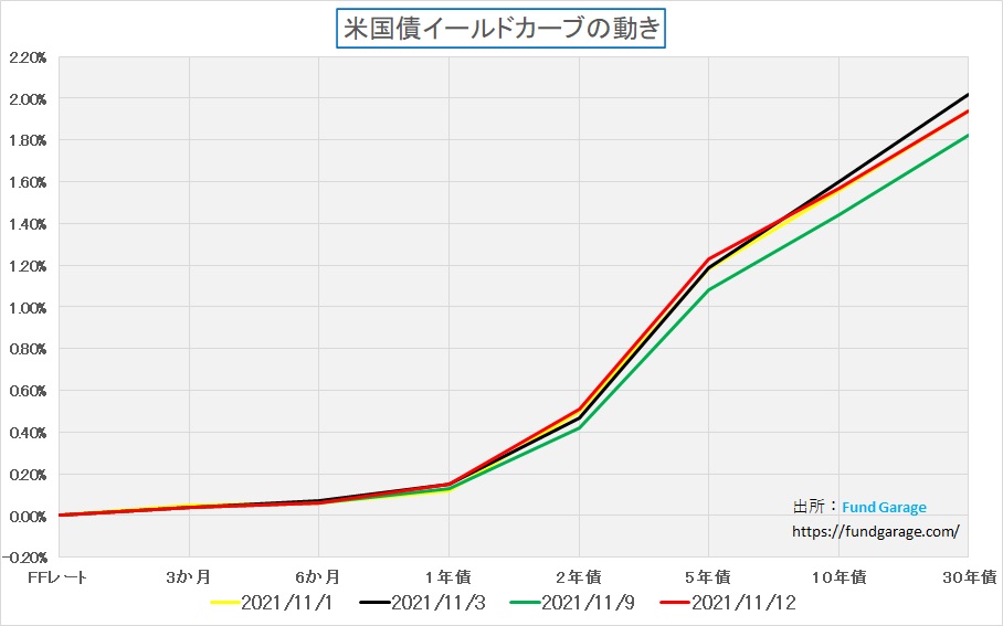 もうひとつはイールドカーブだ。今月に入って30年債金利が一番高ったのが11月3日の2.02%。逆に低かったのが11月9日の1.82%。そして期せずして月初11月1日と先週末11月12日は同じ1.94%だ。その4日分のイールドカーブを示したのがこのチャート。横方向の補助線は0.2%幅なので、いずれにしても殆ど金利は動いていない。