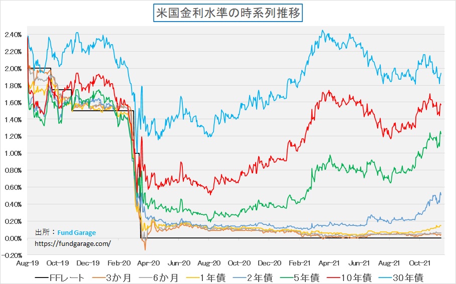 まずは時系列の金利推移、確かに日々上がったり下がったりしているが、所詮30年債で2%弱、10年債で1.6%程度、5年債が1.2%で2年債で0.5%程度のまわりを行ったり来たりしているレベルでしかない。投資信託の信託報酬が1.5%もするのに、こんなレベルで右往左往するとはどうしても信じられない