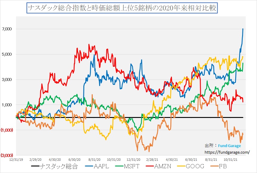 もうひとつ不思議なのがGAFA+Mの動きだ。それは下記のチャートが一番分かり易いだろう。GAFA+Mの5社のナスダック総合指数に対する相対比較をしているのだが「なぜ今、アップル株がそんなに堅調なのか」という疑問に答えが出ない。何故なら、