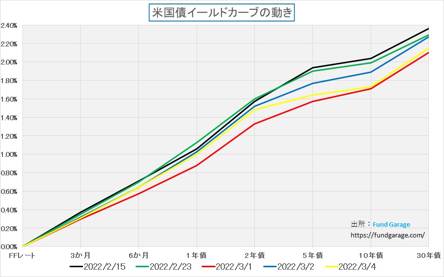 数値で確認すると下記のようになる。イールドカーブの方で黒い線で描かれているのが2月15日。最も低い水準が赤い線で描いた3月1日だが、黄色の線の先週末3月4日と長期金利は殆ど変わらずだ。流石にパウエル議長が「25bpの利上げは妥当」と言い、市場予想を上回る2月の雇用統計が発表された週末に、最もFFレート誘導レンジに敏感な2年債の金利は多少なりとも戻さないと居れなかっただろう。市場は遥かに「War Risk」の方を心配しているように見える。