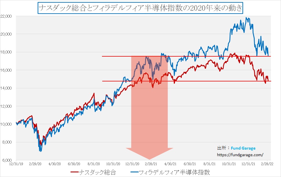 分かり易いように、先週末の水準を起点として、赤い水平線をナスダックにも、フィラデルフィア半導体指数にも入れておいた。真ん中の薄いピンクの矢印が示しているのは、概ねどの程度まで遡ったかを示したつもりだ。すると、明らかに丸1年は株価水準は時間を逆戻しした感じになっていることが分かる。