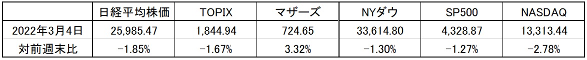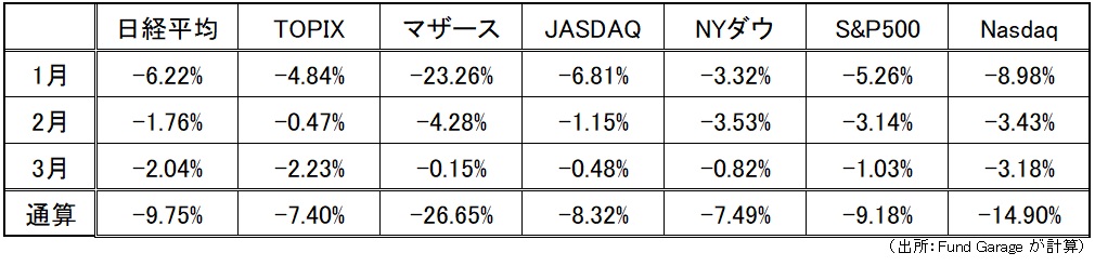 上記表の中でマザーズ市場だけが+3.32%となっているが、これは間違いではない。指数の騰落率だけを計算すると実際に週間の騰落率ではマザーズはプラスとなる。だが当月3月1日(火曜日)から3月4日(金曜日)という期間を取ると下記の3月の欄が示すように、ややマイナスにはなってくる。この辺が指数変化や騰落率を短期間で分析することの難しさであり、問題でもある。それにしても2022年はここまで本当に良いことが無い。