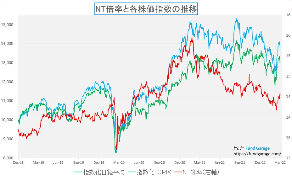 からと思われる。この辺りは状況は、NT倍率を追い掛けるとよくわかる。 下の赤い線がNT倍率(日経平均÷TOPIX)で、このところの上昇ではNT倍率も綺麗にリバウンドしている。すなわち、「市場全体を表すTOPIXよりも、日経平均の方が余計に上昇した」ということ。日経平均は値がさ株の影響を受け易く、それはハイテク株や輸出関連株であることが多い。