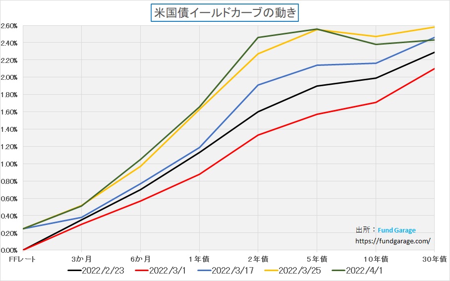 物価上昇やインフレを見込んでFRBが金利の誘導目標をより早く引き上げると予想する人が増えて、利上げに影響を受け易い期間2年の債券は売られ(金利上昇)、一方で長期債である10年物国債、超長期債である30年物国債は景気鈍化を見込んで買われた(金利低下)