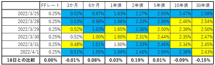 まずは下のテーブルを見て貰った方が分かり易いだろう。青色が前日比で金利が上昇したところ、黄色は反対に金利が低下したところだ。期間がより短い2年債と5年債の方が、期間がより長い10年債や30年債に比べて利回りが高い状態、所謂「逆イールド」という状況が明確に示現した。