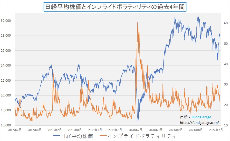 それでは現在の日米株式市場の株価とボラティリティの状況を確認しておこう。まずは米国株市場。やはり「ロシアによるウクライナ侵攻」というイベント・リスクの具現化には短期で恐怖心からの市場に緊張感が高まり、何となく「峠を越えた」という感じからか、株価のリバウンドとボラティリティの急低下が起きている。ほぼほぼ出発点にまで戻ってしまった。