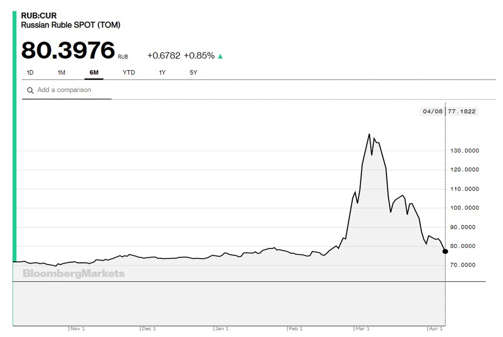 この結果が示す最大の問題点は、経済制裁の抜け穴が幾らでも出来てしまうこと。「経済制裁により国民経済が疲弊し、プーチン大統領の支持率が低下して、結果として政権が内部崩壊を起こす」というのが、宗教戦争として捉えた場合の核戦争にならない数少ない解決策のメインシナリオだ。だが経済制裁の効果が無ければそれもままならない。事実、急落したルーブルは回復している。下のチャートが示す通り、3月初めに急落して以降、あっという間に値を戻しているのが分かる。