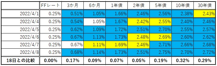 だが今回、2年債金利は殆ど動かないままに、5年債、10年債、30年債と揃って金利を上げて、だいぶイールドカーブとしてまともな形となってきた。5年債と10年債では「逆イールド」と言えなくも無いが、少なくとも一番注目される「2年債と10年債」では逆イールド状態は解消された。実数値でも確認してみよう。それが下記の表だ。