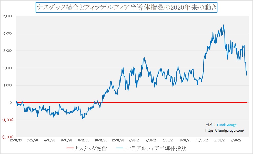 NYダウはほぼほぼ前週末と同水準を保てたものの、グロース株の代名詞でもあるナスダックは4%近い下落となった。半導体関連銘柄で構成されるフィラデルフィア半導体指数はナスダックよりも更に下落している。下記に示すのはナスダックに対するフィラデルフィア半導体指数の超過部分。一気にその貯金を吐き出しているのが良く分かる。