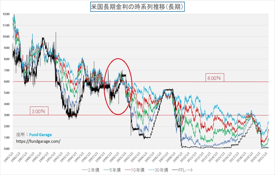 そもそも「金利上昇=株価下落」とまことしやかに語られる定説は本当に真実なのだろうか。答えは「否」である。下のチャートを見て頂きたい。これは以前にもお見せしたことがあるチャートだが、赤丸で囲んだところが「2000年ドットコム・バブル」の時の金利推移だ。
