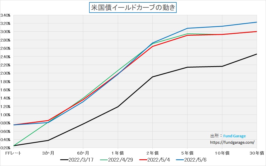 「混乱しているなぁ」と思わずにはいられない米国株市場の動向を他所に、実は肝心な米国債券市場は穏やかなものだ。下のチャートには3月FOMCでFFレートの誘導目標が0.25%に変更された3月17日を黒いラインで、そして「何が出るか分からない」と思われた前週末4月29日が緑のライン、そして実際に50bpの利上げが行われた5月4日が赤いラインで描いてある。そして青いラインが先週末5月6日だ。
