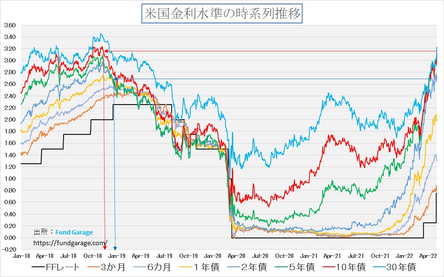 念のため、2018年1月からの金利の動きをフォローアップしておこう。それが下記のチャートだ。当時は2008年のリーマン・ショック以降続いた金融緩和により、充分に米国経済は巡航速度を取り戻し、更に加速しそうな勢いでもあったため、膨らんだFRBのバランシートはそろそ縮小させて良いだろうという多くの判断があった。だが実際に2%まで利上げをしてきたところで、徐々にその勢いを失いつつあると、少なくとも長期金利の方から失速し始めている。実際、FRBが2018年12月19日に2.00%から2.25%に利上げした時には、一旦は11月6日に3.22%まで上昇していた10年債金利も既に2.77%にまで低下してきているのが分かる。