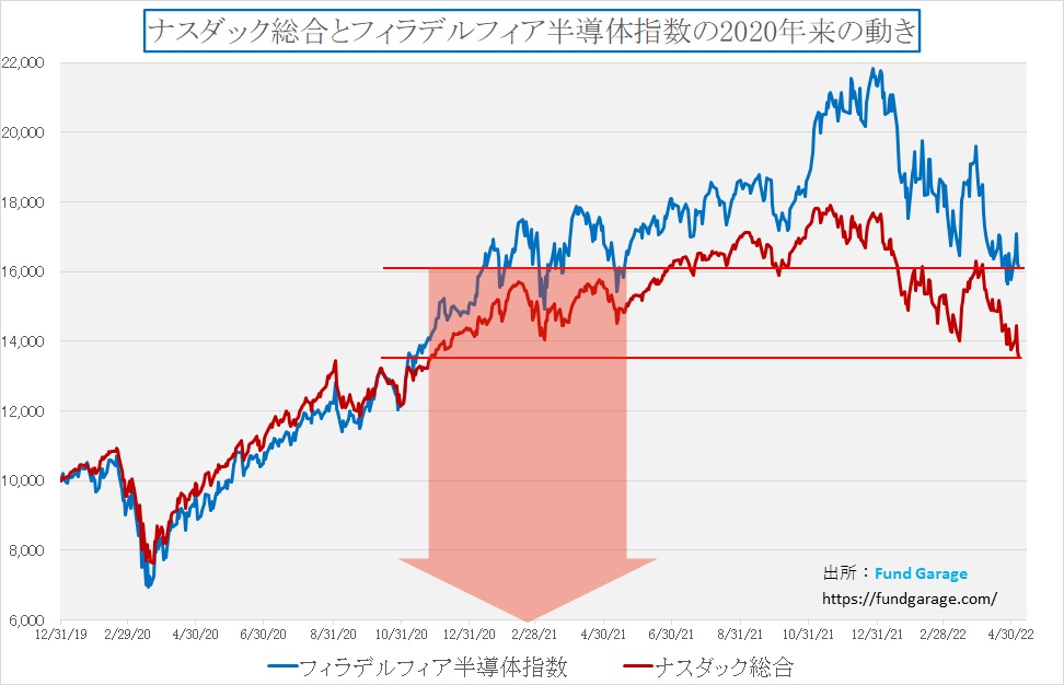 フィラデルフィア半導体指数とは、半導体関連銘柄30種で構成される時価加重平均型株価指数で計算ロジックはナスダック総合と一緒。含まれている銘柄も「ナスダック総合>フィラデルフィア半導体指数」だ。ということは味噌も粕も一緒になって売られているようにも見えたが、ちゃんと市場は味噌と粕を区別していたことが分かる。
