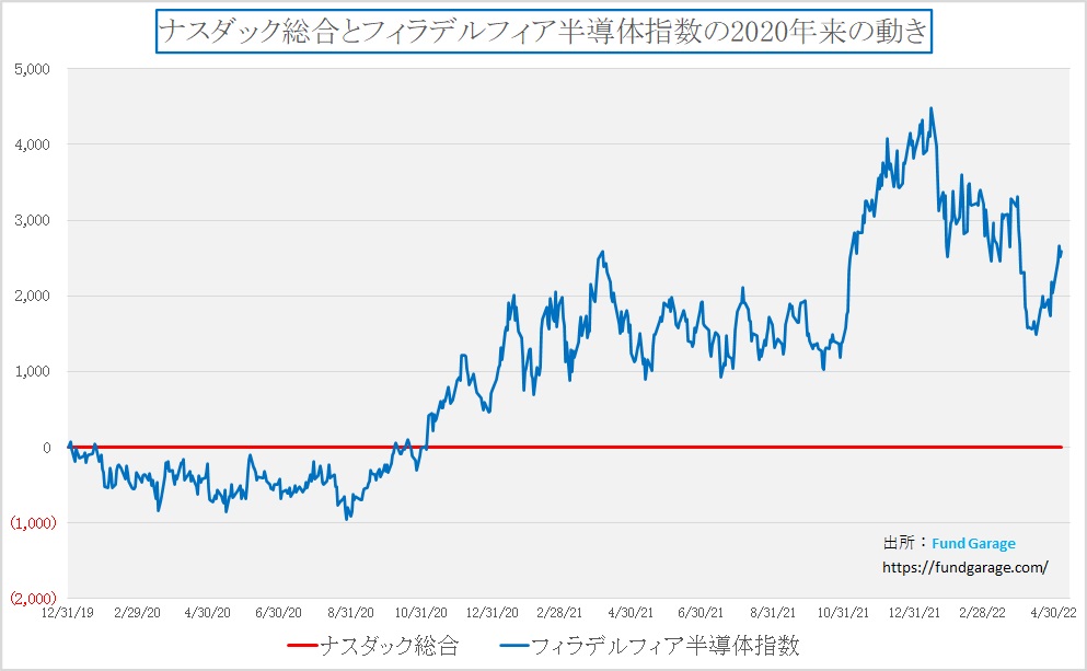 このチャートが示しているのは、指数化した「フィラデルフィア半導体指数-ナスダック総合指数」の同じ期間のラインだ。ナスダック総合を常に基準とするので、赤い線は常にゼロとなっている。ご覧いただける通り、2022年4月27日をボトムに青いラインは切り返しているのがわかる。