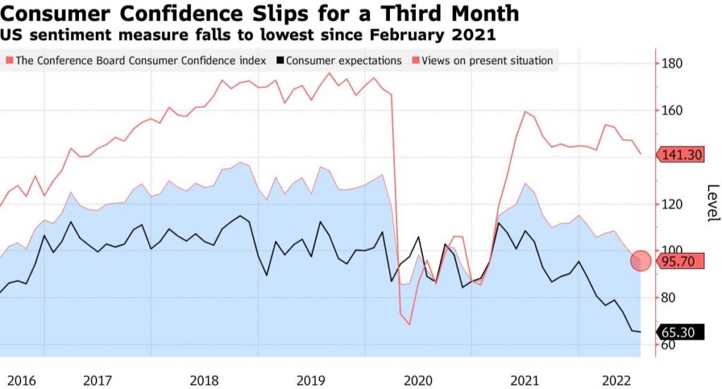そうした一つの証左がこれだ。コンファレンスボードが発表した7月の米消費者信頼感指数(Consumer Confidence Index)は、95.7と2021年2月以来の水準に低下した。低下は3カ月連続であり、市場予想は97だった。
