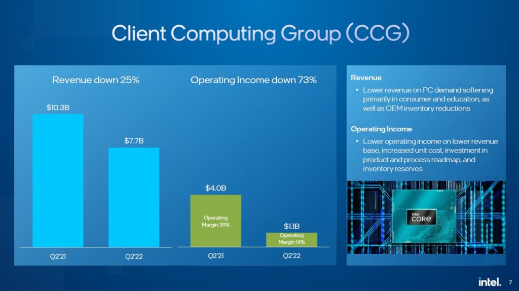 残念ながら現時点では「負け組」の代表格のようになってしまった感があるインテル(INTC)の決算から見えてくるのは、前回「絶対的な実需こそ強い」でもお伝えした見立ての正当性だ。まずは下記のインテル決算資料にある「Client Computing Group(CCG)」についての同社の言い訳を見てみよう。