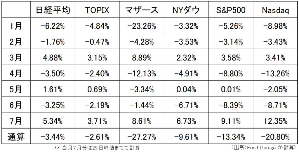 年初来の株価の月別の騰落率も非常に興味深い結果となった。FOMCで2度目の0.75%の利上げが決まる月に、長期金利がこれだけ下がり、米国株市場がこれだけ反転するだろうと予想する人は少なかった筈だ。