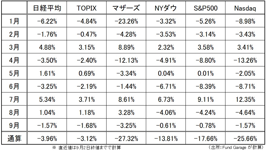 月末を超えたので、月間のパフォーマンスと、年初来のパフォーマンスも確認しておこう。8月の米国株市場は押し並べて△4%超の下落となった。一方で日本株市場はプラスの記録を残すことが出来た。昨年出遅れた分だけ優位に今年は進んでいると言えるだろう。
