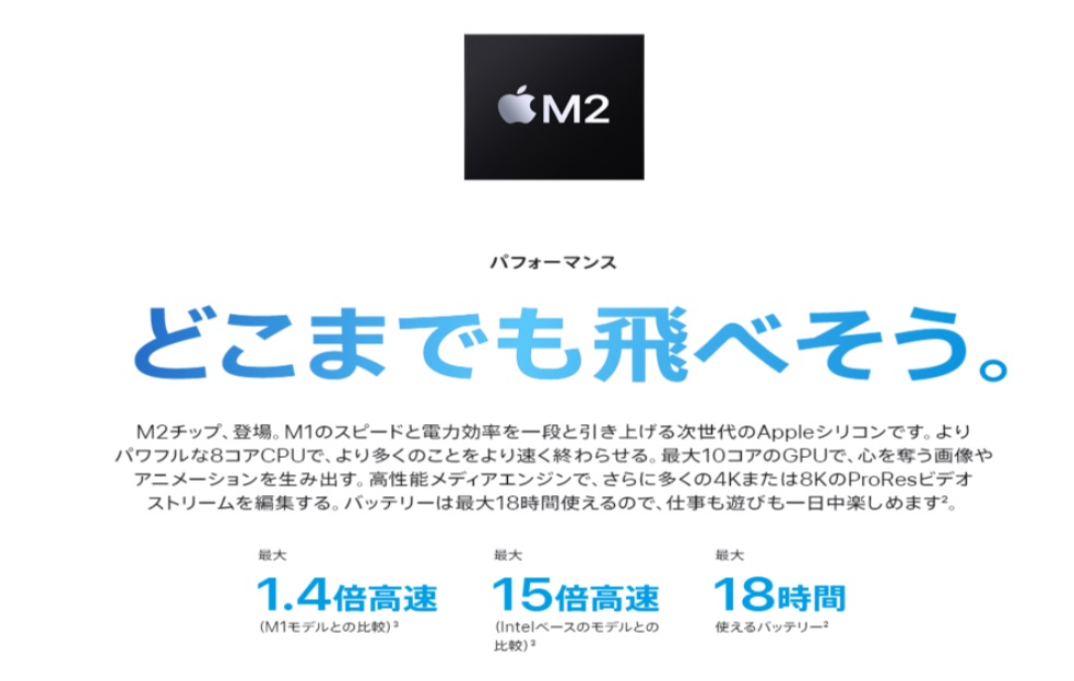 今回手に入れたMacBook Airは最新のCPUであるM2を搭載している。これがまた、ハイテク技術オタクの私には非常に興味津々の代物だ。息子が「これで充分現状はいける」と言っていたCPUの「M1」の後継機だからだ。当然能力はより高い。製造はTSMCで5nmだ。以下のスライドがM2に関する紹介ページだ。