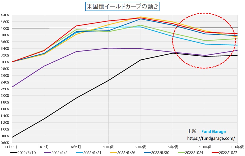 イールドカーブの方で見ると更に面白い。目印として4%水準に黒線を水平に入れておいたが、まず10年債金利は4%を超えたことが無い。そして、前週末9月30日の悲観のピークに比べて、楽観の10月4日は3.92%から3.63%にまで低下している。因みに前日10月3日は3.64%だ。だが、雇用統計を受けた8日は結局3.88%と、実はこれも悲観のピークの頃の9月26日の3.92%を下回る3.88%で終わっている。それは2年債も5年債も同様だ。