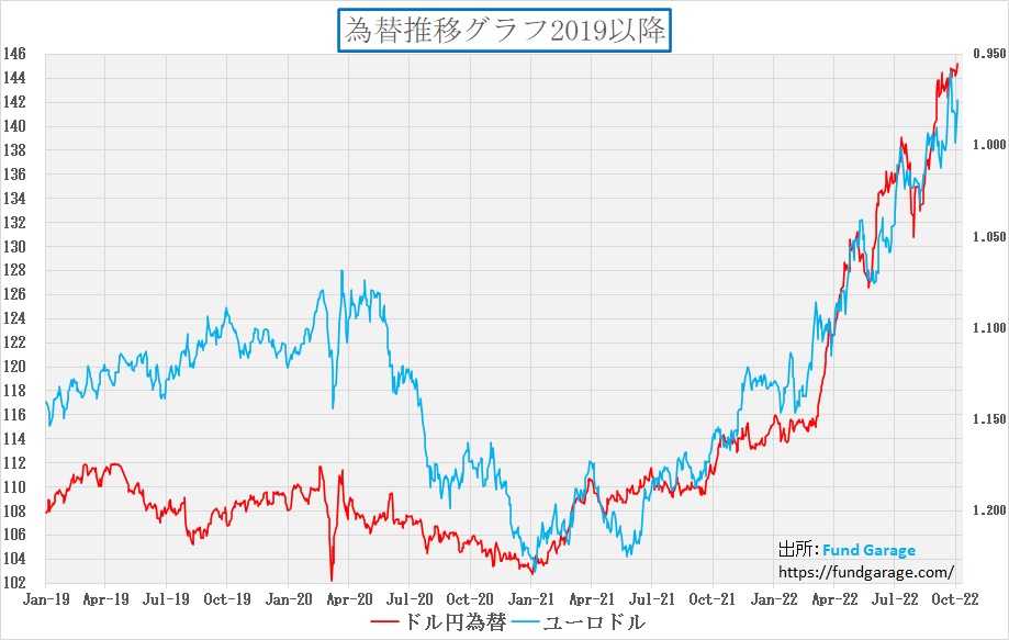 ポンド売りを誘い、市場の関心事を一気に欧州に向けさせた英国トラス政権の目玉政策「大型減税」はイングランド銀行に長期債の無制限購入という窮余の一策を強いたが、その大型減税(450億ポンド)の一部である最高税率45%への引き下げ(約20億ポンド)撤回は一旦はあたかも「問題解決」かのように為替市場は反応した。不思議なことに、欧州景気の冬に向かっての失速懸念も同時に消滅したかのような動きに一旦はなり、対ドルで売られていたユーロが買い戻されもしたが、再び徐々にユーロが売られ、ポンドも売られている。下記に示すのはドル円とユーロドルのチャートだが、ドル円は殆ど居場所を変えていないが、明らかにユーロドルは再び戻ってきてしまった。