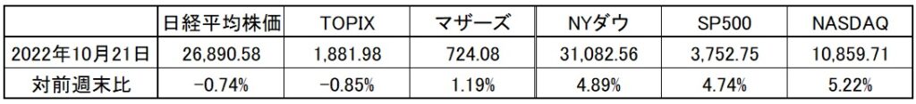 各市場の先週一週間の騰落率は下記の通り。米国市場は概ね全市場が+5%前後となるホッと週末を迎えた。