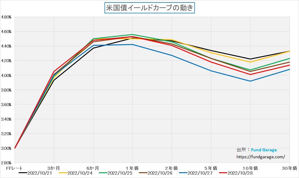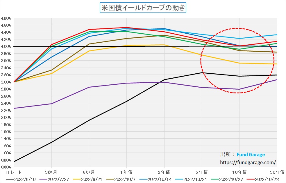 ちなみに、期間の短い金利は週末現在が一番高いところへと上昇してきているが、これは来週のFOMCで0.75%の利上げがあることを織込みにいっただけだろう。