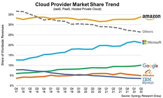 おそらく、ネット通販が無くなるのは困るとか、FacebookやInstagramが使えなくなるのは困るという次元以上にもっと困ることがある。それを端的に表したチャートがこれだ。これは世界のクラウドサービスのマーケットシェアを表している。2022Q2現在、アマゾンのAWSが31%、マイクロソフトのAzureが24%、アルファベットのGoogle Cloudが8%となり、この3社で市場の2/3を支配する寡占状態、取り分けAWSのそれは圧倒的とも言える。これらがもし無くなると、世界中のITシステム、すなわち金融サービス、通信サービス、行政サービス、公共インフラの管理コントロールなどが止まる。