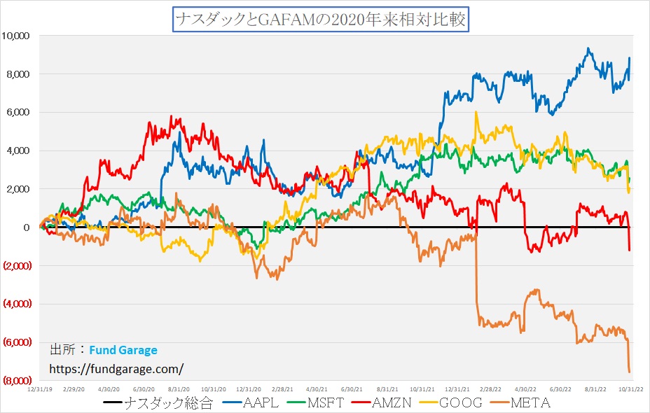 まずは下記のチャートを見て頂こう。GAFAM5銘柄のナスダック総合に対するパフォーマンス比較のチャートだ。見事なまでにアップル(AAPL)を除く4銘柄は足許決算発表後に大きく売り込まれた。