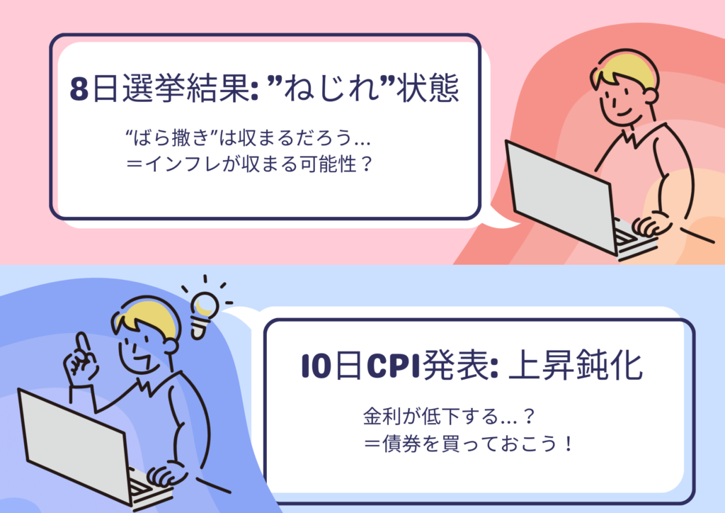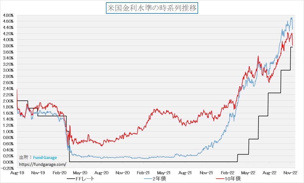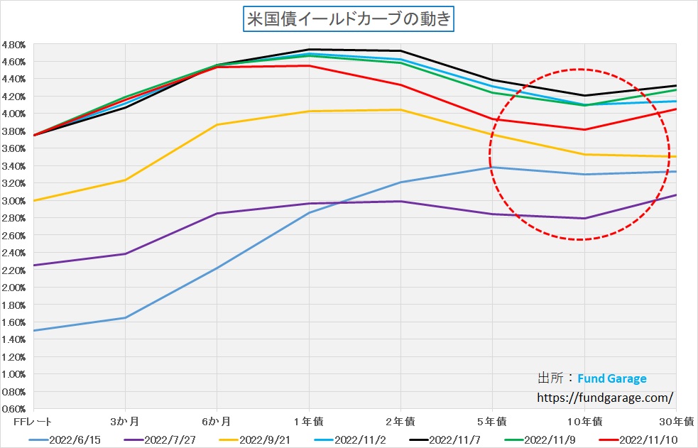 さらに10日には米CPI(※1)が発表された。10月の総合消費者物価指数(CPI)が前年同月比7.7%上昇に留まり、9月(8.2%上昇)からの伸びが鈍化、市場予想の7.9%上昇を下回ったことが発表され、前日、既にベクトルの向きを金利低下に向けていた債券市場では、慌てて債券が更に買われたということが分かる。長期金利が低下するということは、債券投資家が債券を買い込んで債券価格が上昇するという意味だ。(※2)