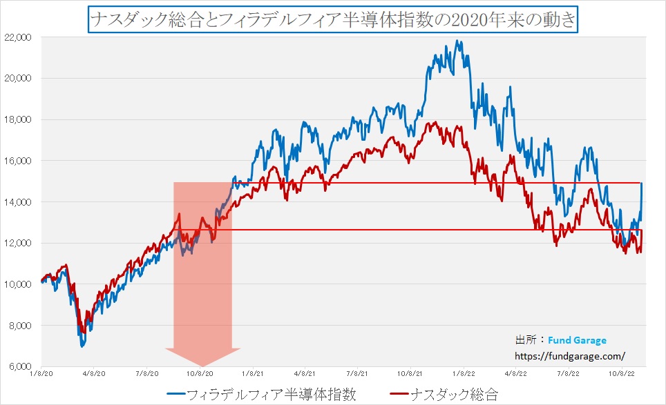 ②ナスダックとフィラデルフィア半導体指数の急騰