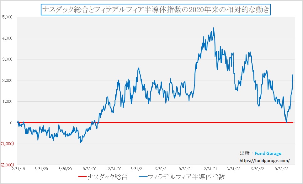 加えて下チャートのように、ナスダックを0として両者の差分を見ると、今回の値動きは2021年の秋冬に似ていることが読み取れる。