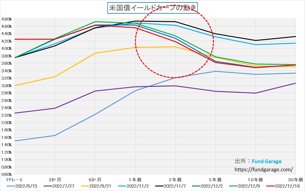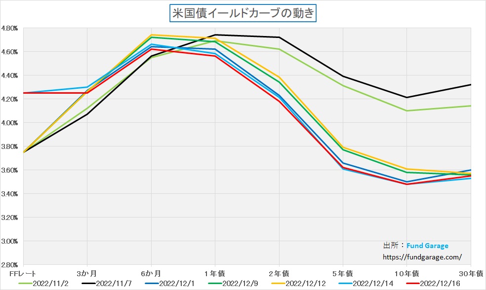 下のイールドカーブのチャートを見て明らかなことは、前回11月の利上げ以降、中間選挙直前の11月7日までのカーブは概ね一緒だが、今月に入ってからの長短金利の水準は、ほぼ一貫して同じ状態を続けているということだ。