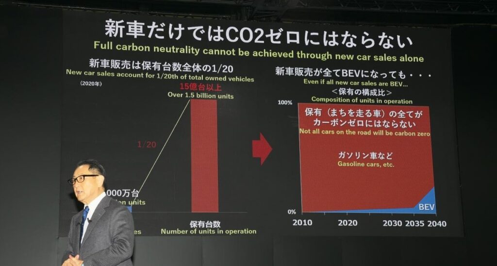 仮に新車が全部BEVになったとしても、カーボンニュートラルの達成は程遠い(下記の写真の右下のチャート参照)からに他ならない。