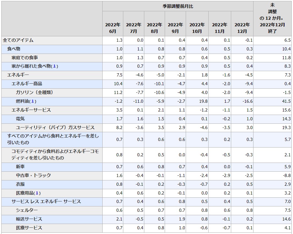 表2で同じ2022年12月の部分を見ると、前月比ベースでは生鮮食品は0.1上昇しており、逆にエネルギーは0.1下落していることが分かる。